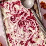 - Add 1/3 of ice cream base to a 5″x 9″ loaf pan. Dollop 1/3 of the blackberry mixture over the ice cream and swirl around with a butter knife or spatula.